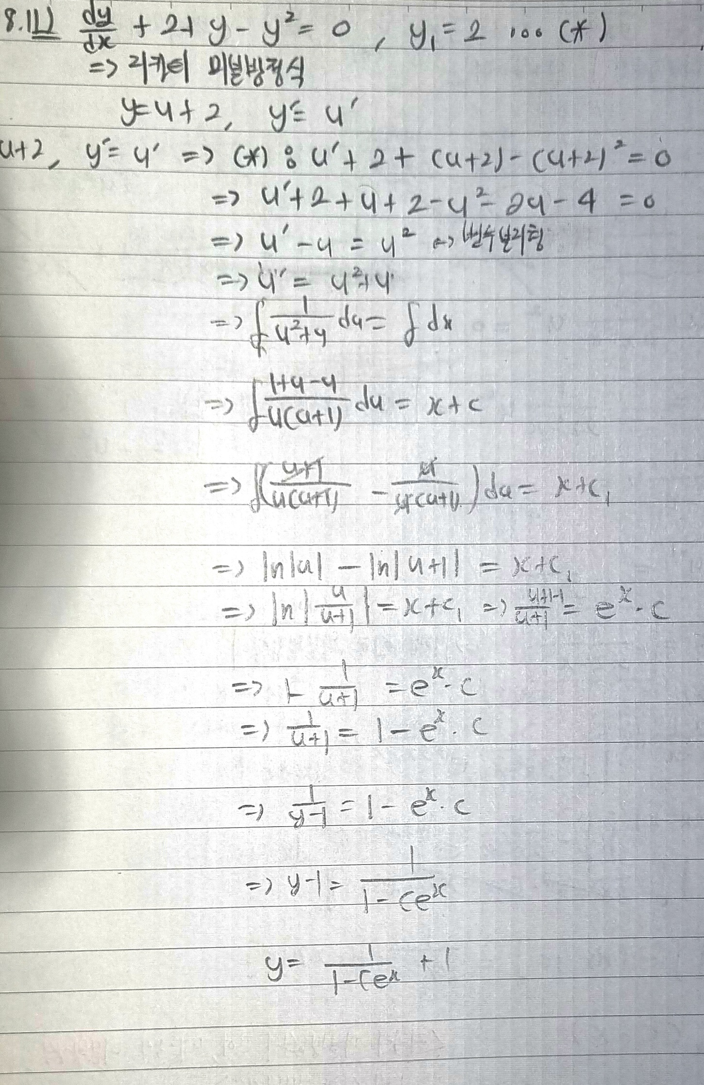 리카티 미분방정식으로 접근해서 나온 식이 변수분리형으로 풀 수 있다고 판단하여 계산했는데 답지의 답과는 거리가 있어서 질문 남깁니다.