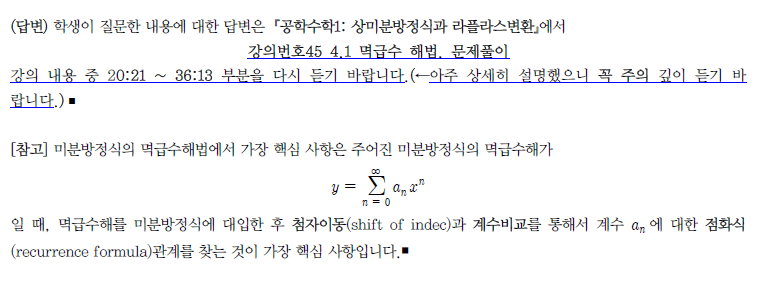점화식을 통해 일반항을 구하는 과정입니다. n에 0~m까지 대입해서 식을 찾았는데 식의 결과가 (m+1)과 a_0에 관한 식으로 표현됩니다. 이 상태로 y=급수해에 그대로 대입하는건 안될것 같고..m+1=n으로 바꿔서 대입하자니, 이 식이 도출될때 n=0부터 시작한 것이기 때문에 맘대로 조작하는것도 안될 것 같고..