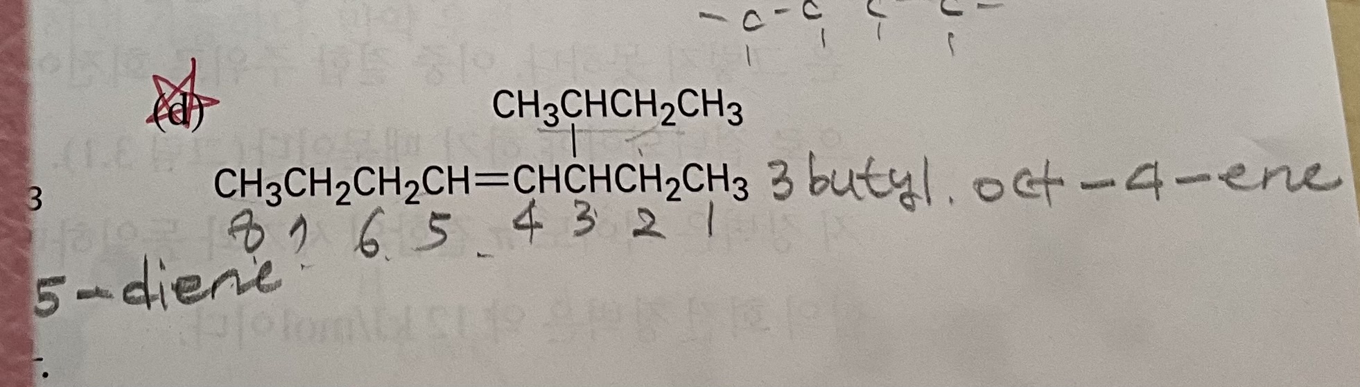 수업내용에의하면 메인사슬에서 이중결합 기준 양쪽 탄소수 동일하니까 작용기 있는쪽인 오른쪽부터 카운트하면 3뷰틸-옥트-4-엔 아닌가요?