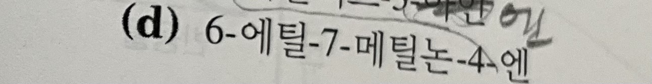 따라서 이중결합을 우선으로 읽어야 하므로 왼쪽 부터 번호를 매기면 6번 탄소에 에틸기가, 7번 사슬에 메틸기가 결합되어 있습니다.
